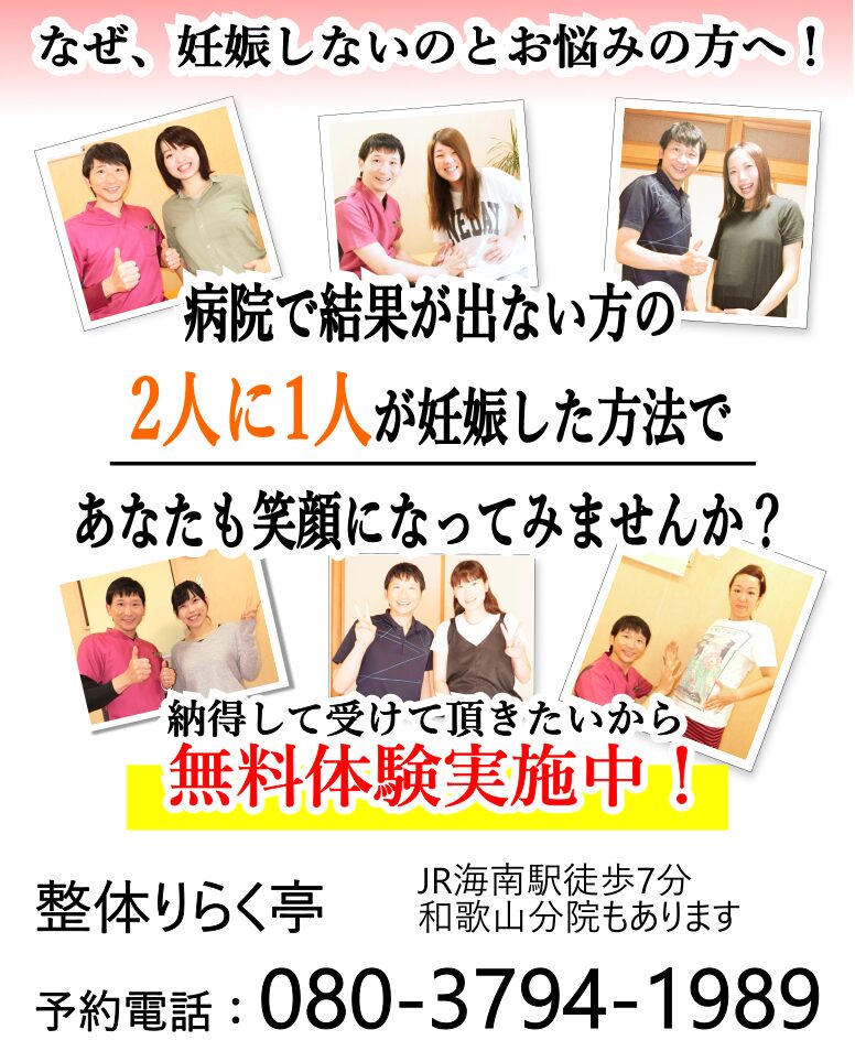 もちろん不妊整体とはどんなものかと言う不安があるのではないでしょうか?そこで当院ではみなさまに内容を十分納得して頂いてから受けて頂けるよう初回無料体験を行っています。毎月限定3名となっています。いっぱいになりますと来月になるのでぜひお早めにお申込み下さい。一緒に妊娠体質を目指していきましょう!