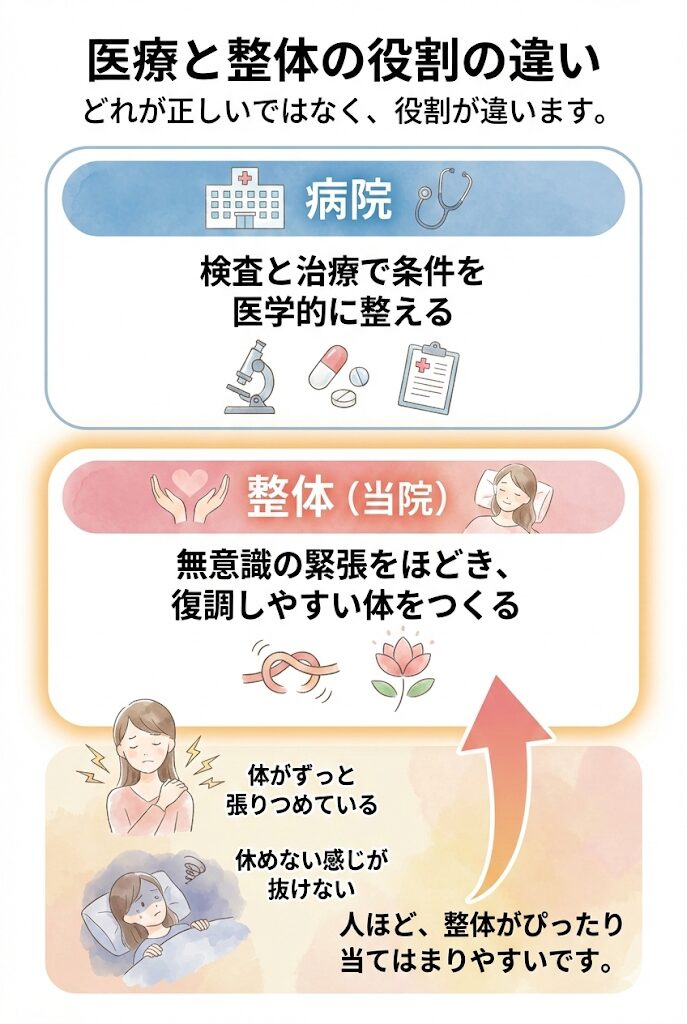 病院と併用できる?:多くの場合できます。病院は治療、整体は土台づくりで競合しません。