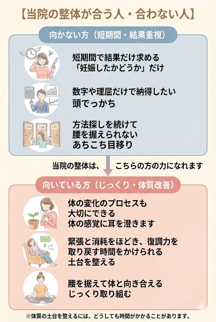 当院の整体は、短期間で“妊娠したかどうか”の結果だけを求める方には向きません。