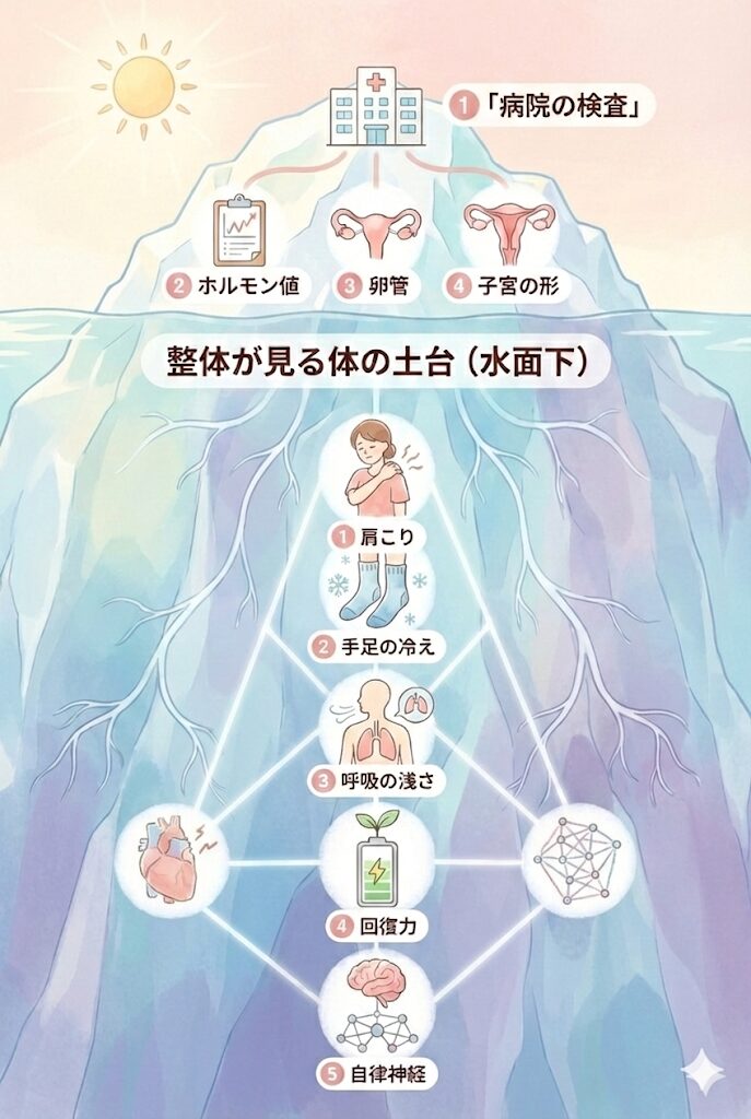 病院が見ているのは、ホルモン値・排卵・卵管・子宮など、検査で数値化できる部分です。これは妊活に必須です。